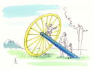 建築家は子どもを持つにいたって遊具に関心をそそぐようになりました。ところが実際には玩具はあっても、一歳から三歳までの子どもにかなった遊具がありませんでした。 そこで、彼自身が直接創案するようになりました。創案するに当たって、つぎのマリア・モンテッソーリの言葉を、姿勢の中心に据えることにしました。 しかし、いざ着手してみると、「自然」という大きな壁に立ちふさがれてしまいました。彼は、子どものころを回想しながら、「木や草や花や虫、それに水たまりやドブや掘にかなわない。そこには、汲めどもつきぬ夢と希望と創造と空間があって、いつでも迎え入れてくれ、包み込んでくれた。そんなものを相手に、何もプラスすることができないし、それを相手にしている子どもたちには、何もアプローチすることはできない」と考えました。 ところが、この悩みは、まもなく解消されてしまいました。今の子どもは、かつての彼のように自然を相手に遊んでいないことがわかったからなのです。 そこで、彼の図式が定まりました。