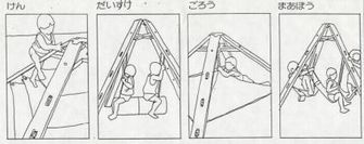 チャイルズハートの遊具には、従来の遊具に備えられている「のぼる」「すべる」「ぶらさがる」という要素に加え、「とぶ」「はねる」「くるまる」の中からいずれかの遊びのパターンが盛り込まれています。